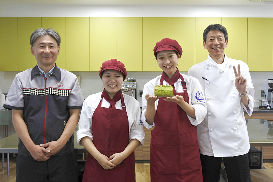 さらにJAふじ伊豆様のバックアップをいただき、製菓・製パン科2年生 紺野 虹七さんが考案した「ニューサマー香る!めっちゃまっちゃロール」を商品化!