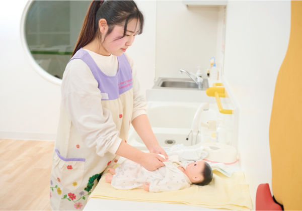 実践的な科目として、教材・遊びを3年間かけ基礎から実践まで学びます。3年次は専門性を高めるため、食育・環境構成・家庭支援などをプラスに学ぶことで現場での実践力を伸ばします。